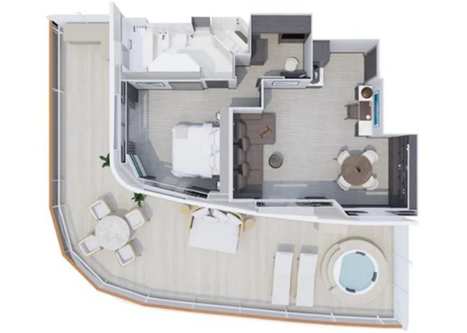 | Serenity Residence Suita 60 m² + Terasa s vírivkou, sedením, pohovkou a lehátkami 7. paluba: 53 m² / 9. paluba: 66 m². Spálňa s obývacou a jedálenskou časťou, šatník. Koktailová súprava, minibar, kávovar, vodná kanvica, ďalekohľad, sejf, mramorová kúpeľňa s vaňou a sprchou. Taška Technogym Case Kit a Technogym Bench. Fľaša šampanského na privítanie. Služby osobného majordóma. Max kapacita 3 dospelí alebo 2 dospelí + 2 deti pod 18 rokov. | 147 150 € 147 150 € za osobu |