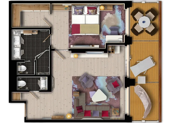 | SUTO - Themen Suite 54 m² + balkón 15 m² so stolom, ležadlom a hojdacou sieťou. Spálňa, obývacia časť, šatník. 14. paluba. Max 4 osoby. Výhody Suite. | 6 936 € 2 312 € za osobu |