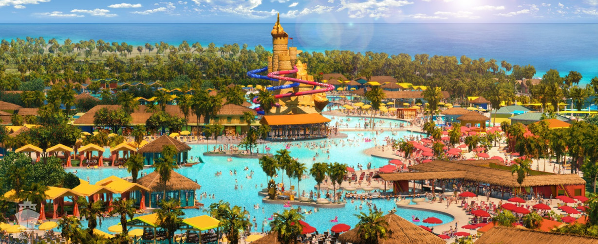- Floating AquaBanas (12 kabín na prenájom) poskytujú osem miest na sedenie, pevný stôl, protišmykové povrchy a priamy prístup do Starfish Lagoon. Chatky sú zoskupené okolo polostrova s vyhradeným nápojovým barom